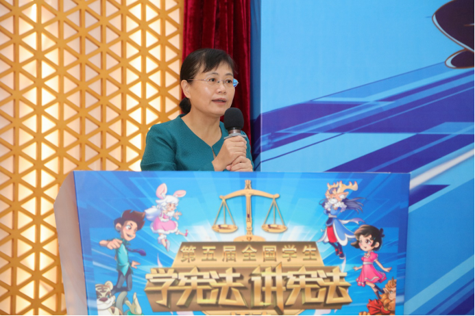 广东省教育厅副厅长那佳代表广东省委教育工委、省教育厅发表了热情洋溢的开幕致辞。她首先对来自全省的参赛选手及澳门特别行政区的特邀选手、指导老师表示热烈欢迎。她总结了我省在历届全国“学宪法 讲宪法”活动中取得的优异成绩,并指出,此次活动在全国新冠疫情防控工作取得阶段性胜利的背景下举行,是青少年普法教育工作的一项重要活动。她认为,32位选手脱颖而出晋级决赛,都是过五关斩六将、非常优秀,希望选手们把这次学习的收获,带回自己的班级、学校、家庭和社区,成为学法、守法、用法、讲法的使者,共同营造尊崇宪法、学习宪法、遵守宪法、维护宪法、运用宪法的社会氛围。最后,那佳副厅长预祝各位选手取得优异成绩,在全国赛场上继续展现广东风采。