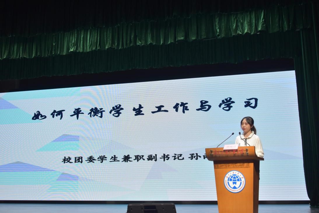 在优秀学生骨干榜样分享环节,广东省学生联合会执行主席张冉、校团委学生兼职副书记孙雨月和陈灏慷依次在会上分享了任职经验与心得。张冉同学以“新时代、新起点、新作为”为主题,分享了其在学生组织工作的故事,激励我们要讲好广外故事,在组织中有所爱、有所期待。孙雨月同学指出,学生骨干要平衡学生工作与学业,具备细心、耐心、责任心,以积极的态度处理工作与学业,鼓励大家做负责任、有作为的学生干部。陈灏慷同学表示,校团委的工作对其产生了深远的影响,带领其站在更高的视角思考和规划问题,同时也希望校团委的工作能激发学生骨干对自身的新认识。