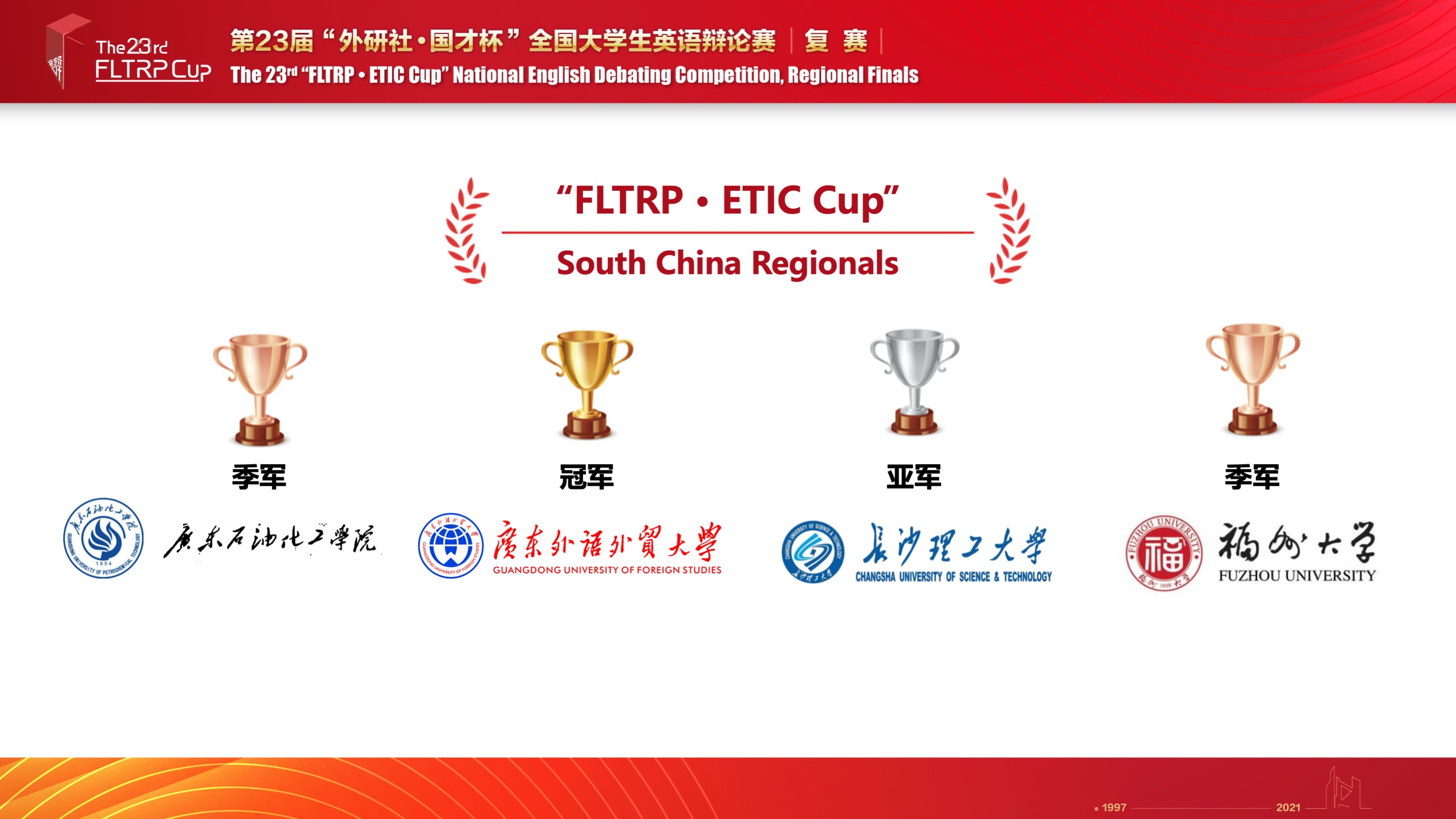 本网讯 2021年4月16—17日,第23届“外研社•国才杯”全国大学生英语辩论赛在云端展开华南地区复赛,来自广东、广西、福建、湖北、江西、云南、贵州、海南、港澳台等共计96支队伍参加了华南赛。校团委指导下的广外德思团队英语辩论队胡艺馨(中文学院)、史佳悦(翻译学院)在专业指导老师王欣的带领下参加比赛,并荣获冠军。此前,辩论队进行了六轮校园选拔赛。