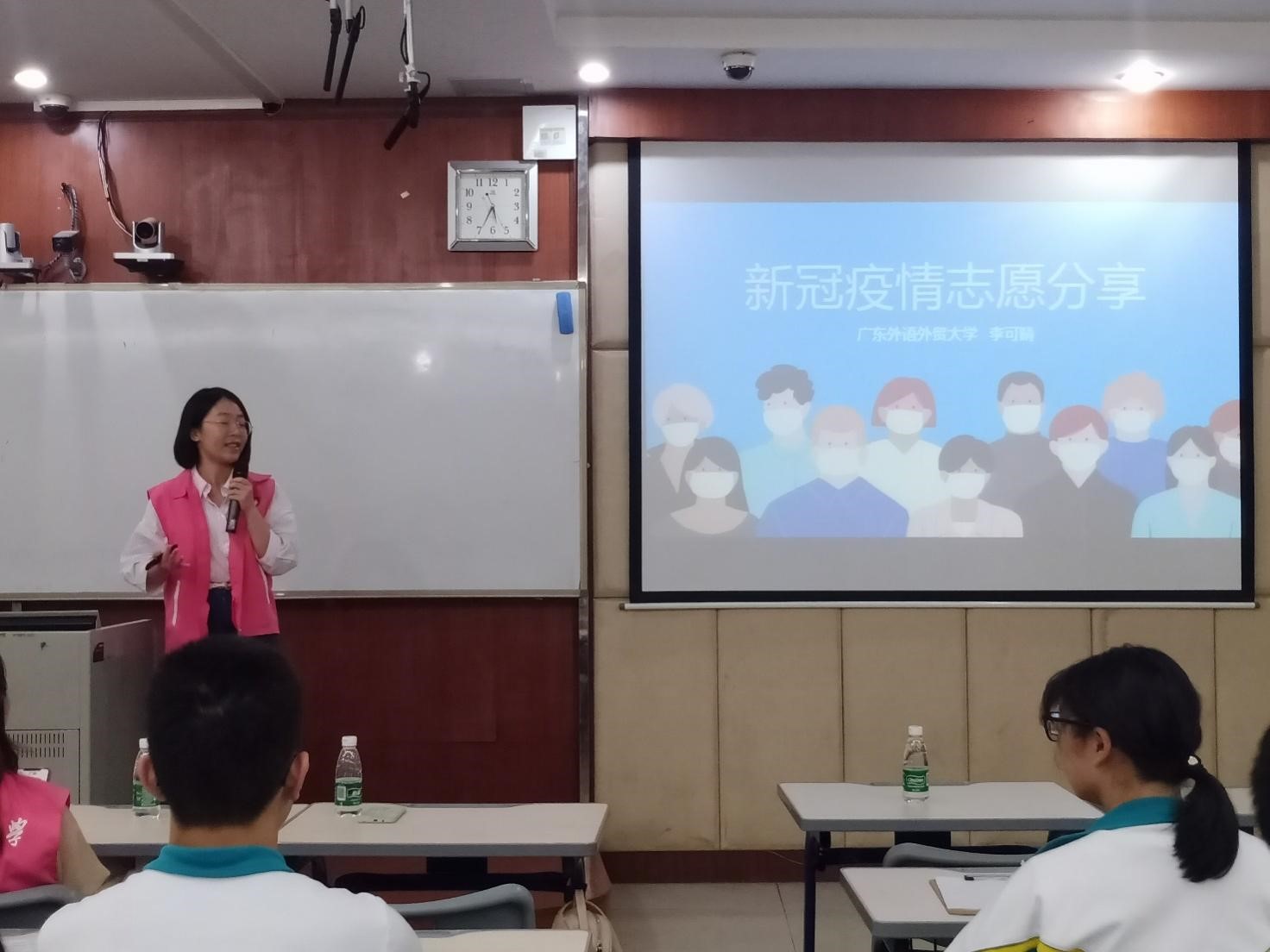作为新冠肺炎疫情防控志愿者,李可晴同学分享了她的抗疫事迹。她指出,在新冠疫情期间,她参与了社区防疫志愿活动,随后又参与了隔离酒店的翻译志愿服务,运用自己的专业特长为抗击疫情的贡献自己的一份力量。当同学问她参与抗疫志愿服务的时候是否害怕过,可晴师姐说她曾担心过,但是因为特别想去做一点有意义的事情,贡献自己的一份力量,所以她毅然投身其中。