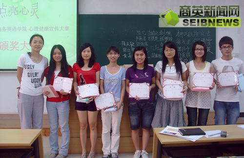 5月27日下午,“点亮心灵——商英心理健康宣传大赛”颁奖大会在六教B201隆重举行。大会分别评选出了心理知识书签、阳光笑脸门贴和心理咨询室路标的一二三等奖。08级辅导员陈思﹑09级辅导员谭秋云以及08级辅导员助理沈从升出席此次大会并担任评委。