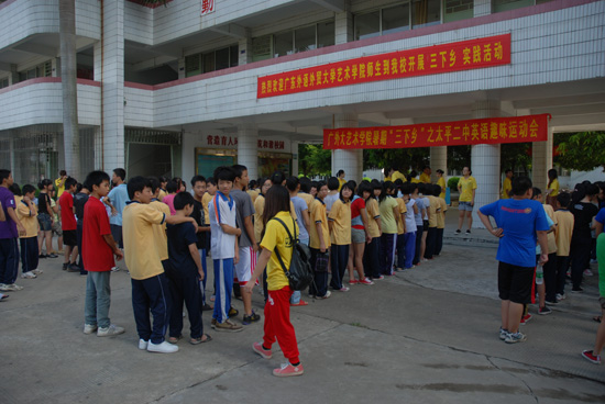 为迎接广州2010亚运会,响应校园阳光体育号召,推动初中群众性体育运动的开展。7月24日,广东外语外贸大学艺术学院“Y&M"三下乡队伍在太平镇太平二中开展了英语趣味运动会。队长黄星组织召开了活动开幕式。
