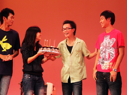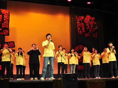 院歌队队员一上场就赢得一片掌声,演唱者们深情款款,《星月神话》《寂寞先生》《forever friend》的演唱明显地带动了全场气氛。队长谢超宇一曲《痴心绝对》更是赢来了无数喝彩掌声,而10级计算机5班的王周同学在唱《我爱他》时十分华丽的高音让场上顿时掌声雷动,尖叫声一浪盖过一浪。