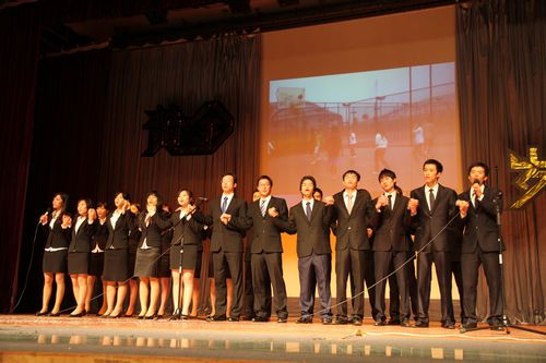 而国贸086的舞台剧《我们的纪念品》则为学子们再现了广交会的推销现场,他们的班级原创歌曲深深触动了每一个观众的心弦,那种从懵懂走向成熟的心路历程让他们百感交集。最后经济081的合唱《难说再见,相约未来》为大会画上了一个圆满的句号。优美的旋律告诉我们,尽管广交会结束了,但前进的脚步不会停下,经贸学子们的奋斗也必将继续下去。