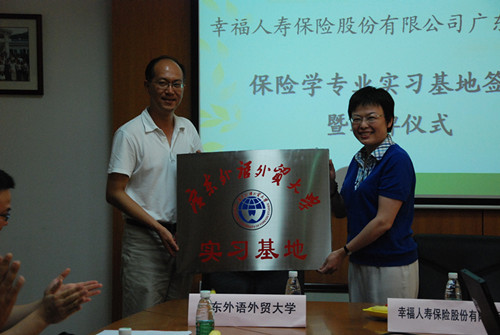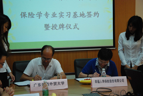2011年6月23日下午2点30分,广东外语外贸大学与幸福人寿保险股份有限公司广东分公司保险学专业实习基地签约暨授牌仪式在南校区院系办公楼经贸学院会议室隆重举行。幸福人寿保险股份有限公司广东分公司总经理助理胡筱红,人事行政部总经理王甦,人事行政部机构发展岗经理张辉,人事行政部人力资源岗经理宋啸天,广东外语外贸大学经贸学院院长李铁立教授,风险管理与保险学系主任展凯副教授,学工办陈健老师以及保险系的师生们出席了本次的签约仪式。