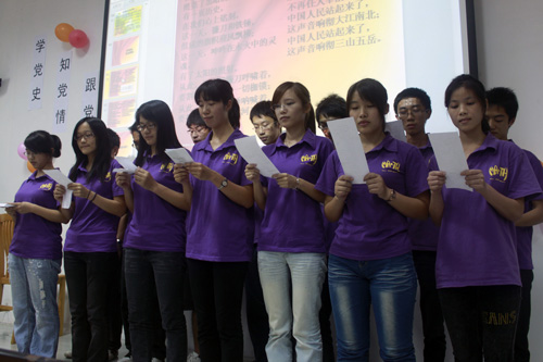 大合唱和诗歌朗诵也为展示过程增添了不少活力和激情。计二班和网工班分别现场合唱了《爱因为在心中》和《为了谁》,数学班和信管班也分别带来了诗歌朗诵,抑扬顿挫的声调中包含着对党的热情和追随。