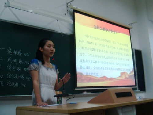 紧接着举行的是团干党史培训。董婷称举办这次活动是为了迎合建党90周年举办关于学习党的活动的一大潮流,其目的不在于向同学们灌输什么,而是为了引发同学们的思考。学习党史是为了以历史经验来指导今天的活动,从而继续党的成功经验。“你们要坚定信念,要知道自己是祖国未来的接班人,要有信仰,要以身作则,要明确共青团的干部要跟着党走,把向先进的党组织靠拢作为自己的奋斗目标。”在她的整个讲话中“坚定信念,有信仰”一直被强调着。在她讲话完毕之后,徐集优为大家介绍了优秀共产党员--阮啸仙。同时,他还讲起了自己中学时申请入党的事,并鼓励大家积极入党。