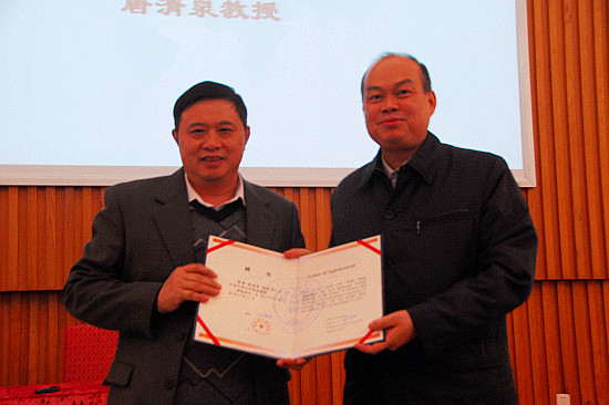 首先,卢景辉为唐清泉颁发了广东外语外贸大学客座教授聘书,并赠送了大学纪念品。