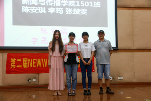 本网讯 5月19日晚上,第二届NEWWORK广告创意大赛颁奖典礼在图书馆报告厅举行。本次比赛的赞助商、华文食品公司华南市场推广的负责人刘鑫和仇晟、我院院长杨魁、党委副书记黄石胜、广告系主任蔡卫平以及广告系老师李淑芳出席了本次的颁奖典礼。