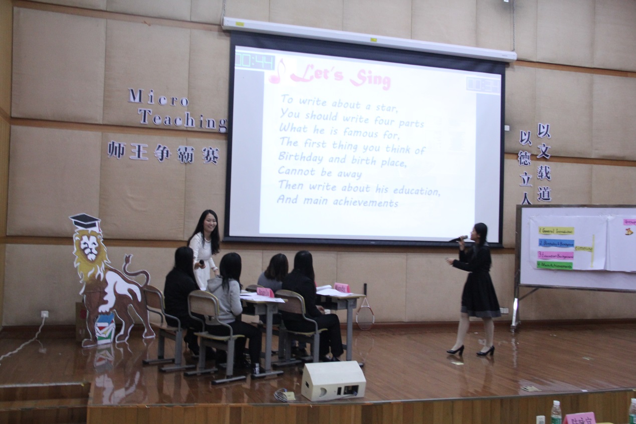 第六组选手林雅洁,黄诗怡以“how do you get to school”为主题,教给学生出行的日常表达。第七组选手黎颖,蔡琬琳手握网球拍在舞台亮相,亲切可人的形象拉近了师生的距离,活泼生动的课堂氛围勾起人们对知识的渴望。第八组选手周冬妮,林苡以小组讨论的形式逐步引领学生做人物介绍,又以歌曲的形式将英文与音乐完美结合,取得了意想不到的效果。第九组选手鲁珊,郑欣强调课堂词汇与对话的学习,提高学生口语能力,让语言真正运用到实践中来。第十组选手夏颖围绕“My dream job”的主题,动员学生帮助卡通人物天天实现梦想的同时,激起了同学们对自身梦想的展望与思考。