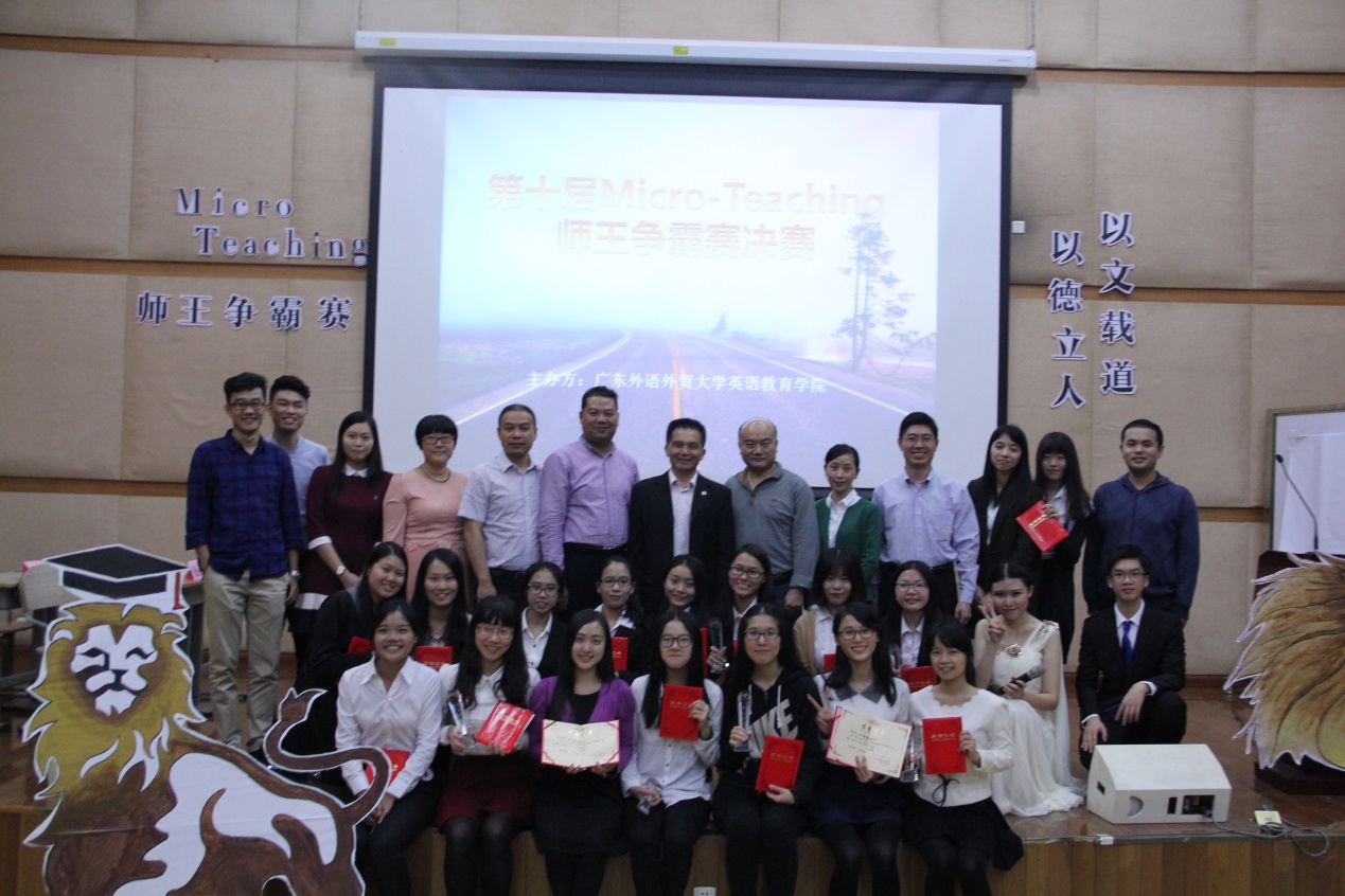 本网讯 2015年12月2日晚七点,由英语教育学院举办的第十届Micro-Teaching师王争霸赛决赛在广东外语外贸大学南校区图书馆报告厅隆重举行。出席本次师王争霸赛的嘉宾有英语教育学院党委书记林绍雄,副院长陈金诗,党委副书记徐昶斌,团委书记林泽龙以及广州学而思主管尹辰。大赛吸引了来自英教大一至大四的学子,10组选手在台上一展师姿,奋勇夺魁,展现师王风采,共树师表风范,最终,1301班的组合选手——林嘉丽和吴子宁获得冠军。