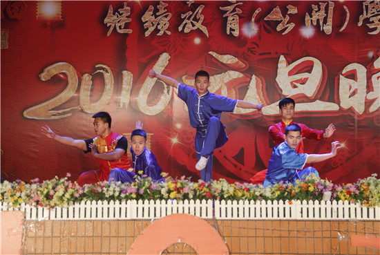 何勇斌发表了新年贺辞,与在场师生共同回顾了2015年学院的发展与变化。他说,2015年,我院发扬自信、自强、拼搏、进取的精神,不断完善学院运行机制,改善办学条件、加强管理,学风教风有了进一步的改善。学院的稳定与发展,凝聚着全体师生的心血和汗水,向大家致以衷心的感谢,并祝大家新年快乐。讲话结束后,进行了“统考高分奖”的表彰仪式,何勇斌和任跃忠为在2015年10月自学考试中获得全省最高分和单科85分以上的同学颁发了奖状和奖金。