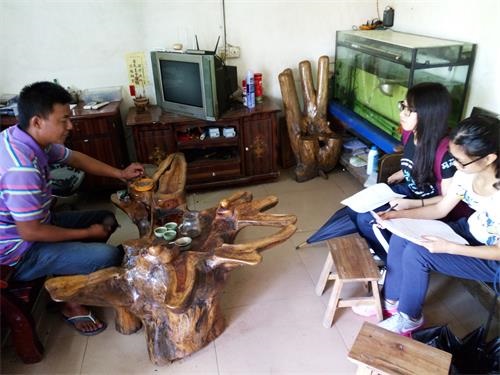 与此同时,普查组的陈子琪,石子豪,麦梓盈同学也继续着下乡的行程。在短暂的居委会碰头以后。他们一并去到了大洞镇街上进行问卷调查。今天的天空万里无云,阳光显得格外的猛烈。街上人流与赶集的那天相比冷清了不少。街的两旁稀稀落落,首先寻访的是一户茶叶店中的老板。茶叶店不大,从门口进去一瞥便可看完全景。老板热情地倒了三杯茶。茶水不满不亏,足以看出这一老板也是一位很讲究的人。细问得知,老板是本地人,主业是牙签厂。在镇上算是中上以上的水平。但谈起近况,却也有点沉默寡言。谈着谈着,一位瘦瘦略高的中年男人进来。陈子琪趁机微笑着也向这位先生调查。相比起老板,这位老板的朋友就显得落魄得多了,他住在大洞镇下属的苗花村,务农为生。面朝黄土背朝天,奋力拼搏也只能维持3餐。调查结束临走时,他们都热情地邀请3位同学多去坐坐,眼里满是亲切。多么纯朴的人家!