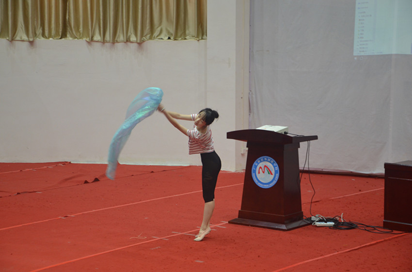 待严肃的讲话过后,欢乐的时光又到来了。学生们都十分期待队员们的小语种歌曲串烧表演节目,而队员们也并没有令她们失望,让学生们听到了来自马来语,阿拉伯语,越南语和印地语及乌尔都语的歌曲,语言的音韵美令人如痴如醉。在舞蹈环节,队员林钰以两种姿态展示了爵士舞蹈的动感美。她那灵动的身姿,富有节奏感的舞步,引得全场赞叹不断。而刘沁则以一条丝巾,凭借着柔若无骨的身体,展示了艺术体操的优雅美。她那飞翔在空中的优美的舞姿,引得全场惊叹不已。