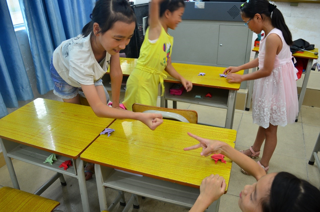 在这些正式教学之外,文宣人的身影同样不可忽略。在今日课堂教学结束之后,文宣组组织了一场充满兴味的活动——“青蛙大作战”。孩子们对老师所教授折纸内容充满兴趣,大展手工才能,迅速折出了一只周正的青蛙。而具有挑战的是之后的比赛环节,孩子们拿出自己的青蛙与周边的小伙伴相互竞争,获胜者可以获得对方的青蛙。失去青蛙的小朋友却可不必伤心,他们向老师拿来折纸,折出一只新的小青蛙继续参加比赛。这是本次活动的目的之一,希望他们在这次活动体会到“失败并不可惧”。