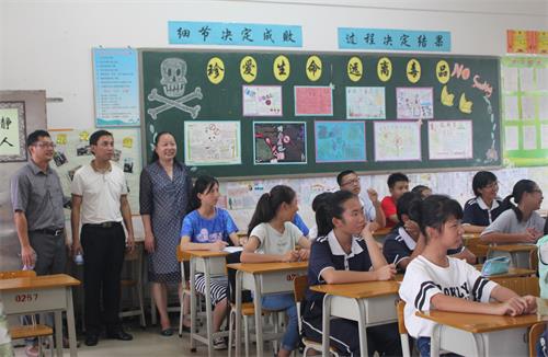 黄书记和赖书记也深入课堂,观看了义教组的现场教学。正好班里在上英语课,由于杨俊老师生动的讲授和积极的互动,课堂氛围十分热烈。同时,老师纯正的口音也获得了黄书记的肯定,“英语是广外的特色,三下乡的教学就应该发挥我们的特色”。