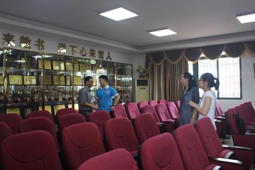 随后,在赖雄斌书记的带领下,黄书记等来到会议室,就学校的学术氛围和教学进行了进一步的交流了解。面对会议室里“静下心来教书,潜下心来育人”的标语和大大小小的奖杯,黄书记表示,“这些体现的就是一个学校的文化底蕴啊”。黄书记也希望,三下乡队伍的工作能帮助学校培养更优秀全面的学生,将学校已有的荣誉继续发扬光大。