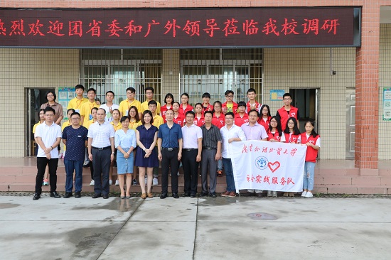 本网讯2016年7月14日广东外语外贸大学商学院党委副书记罗海洋、团委书记杨欣、辅导员尚丹、杨柳、刘富先一行来到韶关乐昌的廊田中学,对参加今年“三下乡”社会实践活动的队员们表示慰问,并对基地各服务队的工作进行了相应的指导。本次参加座谈会的还有团省委办公室主任科员赵冠中、团省委办公室科员陈俊宇、李晟以及乐昌市团委书记赵平平、乐昌廊田中学校长沈孝荣、广外商学院团委副书记郭锋、学生会主席何晓彤等学生代表。