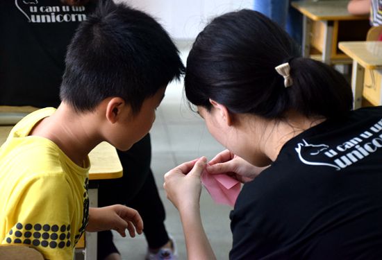 今天学生们首先接触到的是折出新世界—折纸课。折出新世界是一门生动有趣,并且能提高学生们动手能力和创造能力的课程。在今天开展手工课堂中,学生们热情满满,用他们丰富的想象力和很强的模仿与动手能力,创造出了各种各样的手工作品。在授课队员和各班班导的帮助下,学生们都出色的完成了自己的手工作品,更有学生们在老师所教内容的基础上进行加工和创造,完成了充满意外与惊喜的成果。好玩的手工课让学生们流连忘返,使得他们都更加期待着下一节手工课的到来!
