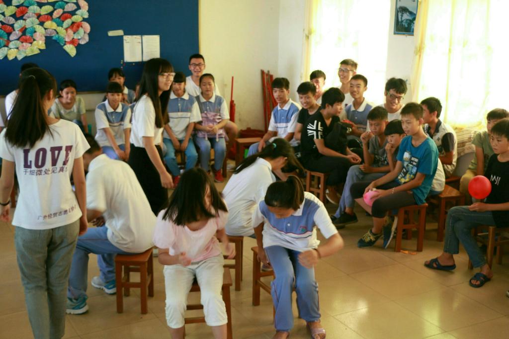 乡遇队员们和学生们一起玩游戏,在游戏的过程中互相认识,欢声笑语打破了初次见面时的尴尬和不安。