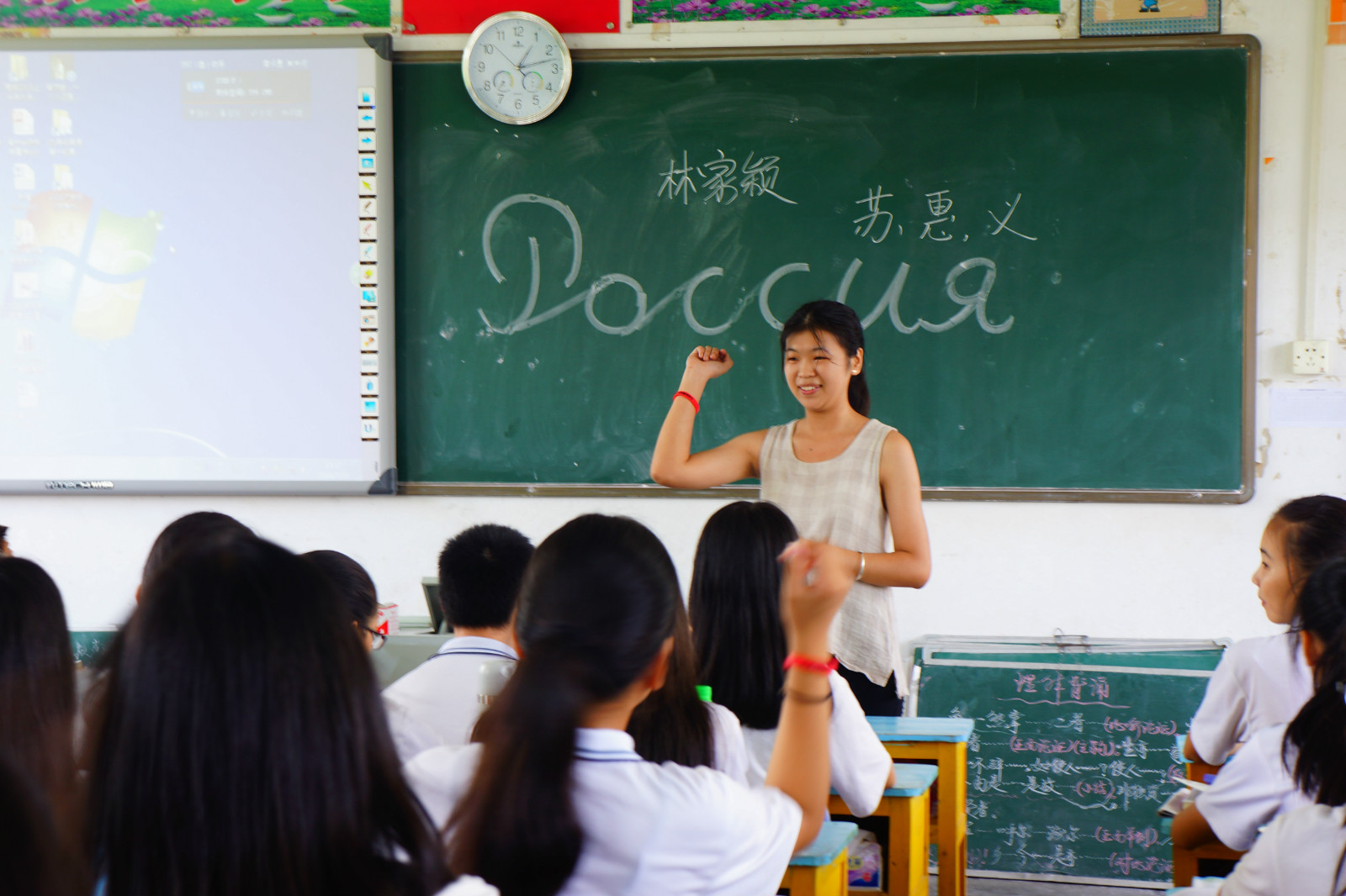 另一边,二班的俄语课也在紧锣密鼓地进行中。由苏慧义带来的俄语课也引发了同学们不笑的兴趣。在一段俄罗斯概况之后,苏慧义用一段短片向同学们介绍了莫斯科一系列的著名建筑。壮丽宏大而又不失精致美感的俄式建筑让同学们都沉醉在奇妙的建筑世界中。紧接着,苏慧义又向同学们展示了俄罗斯的工业品,套娃,并讲到了俄罗斯的体育。从老师和同学们不时的互动中,可以感受到同学们对外面那异彩纷呈的世界充满了无限的向往之情。在一节课之后,同学们也对俄罗斯有了一个更加具体深刻的印象。