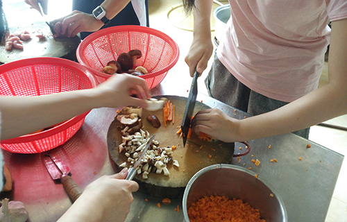 包饺子看似容易,实则复杂。最复杂的环节在于饺子馅的准备,制作馅料的过程持续了将近一个多小时。义教组的老师们做菜的得心应手程度竟然和讲课有得一比,切萝卜丝“快准狠”。男生们亦是不可小觑,切肉、剁肉,不见一点生疏感。