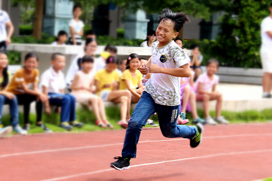 接下来的项目则是“我是情报员”。每队选出一支四人的队伍来到了跑道上,按4*100接力站好位置。裁判员告诉第一个组员一串数字,当小朋友认为记好后开始跑,跑到第二个组员时把数字传达给他......直到最后的组员到达终点线后报出数字,以数字是否准确和用时多少来判定胜负。第一轮比赛中,孩子们热情高涨,组员们跑出了很快的速度,整个赛道都是欢呼呐喊,不过遗憾的是两个队伍都没有报出正确的数字;第二轮中,两队吸取第一轮失败的经验,稳中求胜,最后都准确的报出了数字。而“四叶草”队用时更短,在这一个项目中扳回一城。