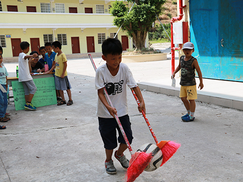 众多游戏中最受欢迎的当属“单人夹足球”了。“单人夹足球”要求小朋友用两只扫帚将足球夹住并前进2m,若中间足球掉落,需重新夹起并前进直至终点。一些高年级的小朋友玩起来得心应手,很多都在20s内就完成了,也有一些可能是过于着急,在半路掉了下来,浪费了不少时间,但最后还是成功到达终点,赢得印章。相比而言,低年级的小朋友略微处于劣势,但他们并不畏惧。还没有扫帚高的他们小心翼翼地用力夹着足球,有的是稳中求胜,一步一步地向终点移动;有的则是抱着赌一把的心态,飞奔而去,不仅成功完成任务,更是创下了3s的记录,赢得了队员们的鼓掌欢呼。