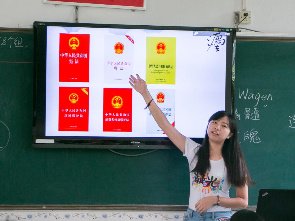 今天上午,为了更好地展现法学院的特色,梁惠珊和吴慧琳两位老师分别给两个班的学生上了两节别具特色的普法教育课。其中,梁惠珊老师以解释“灋”及其古代传说为开头、以介绍与法律有关的职业为切入点,为同学们讲解了《未成年人保护法》的相关内容。当问及我国具体有什么法律之后,有位同学站起来说“有《宪法》、《刑法》、《未成年人保护法》、《消费者权益保护法》、《知识产权法》……”班上同学都为这位同学精彩的回答鼓掌。在课后,同学们仍热情不减,有的在组内与同学们讨论课上的问题;有的跟老师一起互动交流;有的在翻着政治书查看相关的知识……同学们都纷纷表示这堂普法课收获颇多。