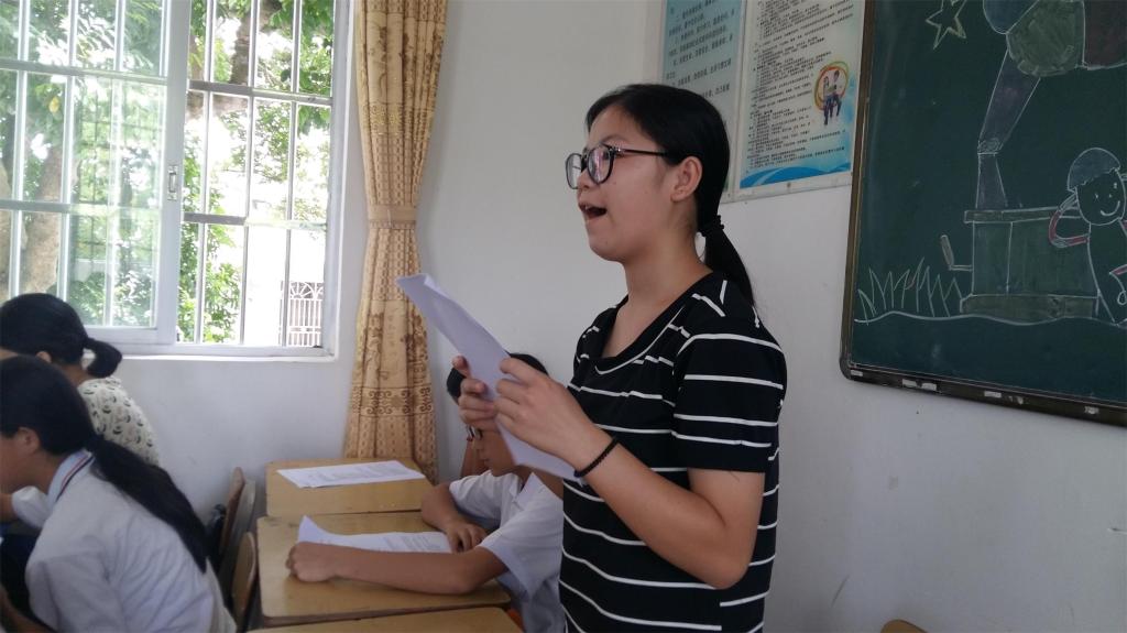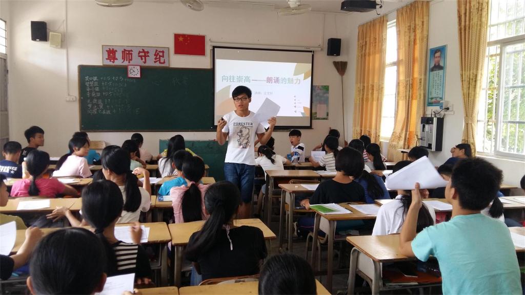 本网讯2016年7月20日是金融学院堇熙三下乡服务队下乡的第六天。早上8点45分,我们的王文轩老师给小朋友们上了一节主题为“向往崇高——朗诵的魅力”的朗诵课。课上,王老师激昂的朗诵感染了小朋友们,每个人都沉浸在诗歌的魅力中,随后,老师讲解了一些关于朗诵方面的小技巧,让小朋友们能够更好的巩固这节课的知识。