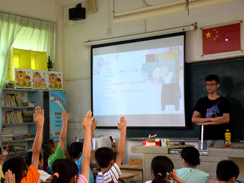 基础英语板块分设了日常口语课(small talkshow)、动画跟读模仿课、音标课、语法课和阅读课等,而低年级则另设了英语字母复习课。在日常口语课中,学生们掌握了一些实用的日常交流句型,如时间交流和购物常用句型。课堂上,为达到更好得到教学效果,队员们在课堂中加入了互动环节和有趣的小游戏,学生们的课堂表现极为活跃。