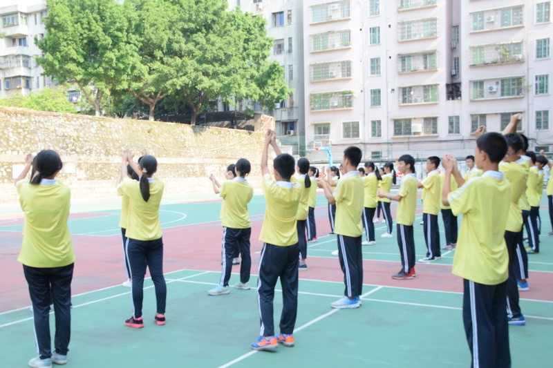 同学们在老师的带领下做热身运动