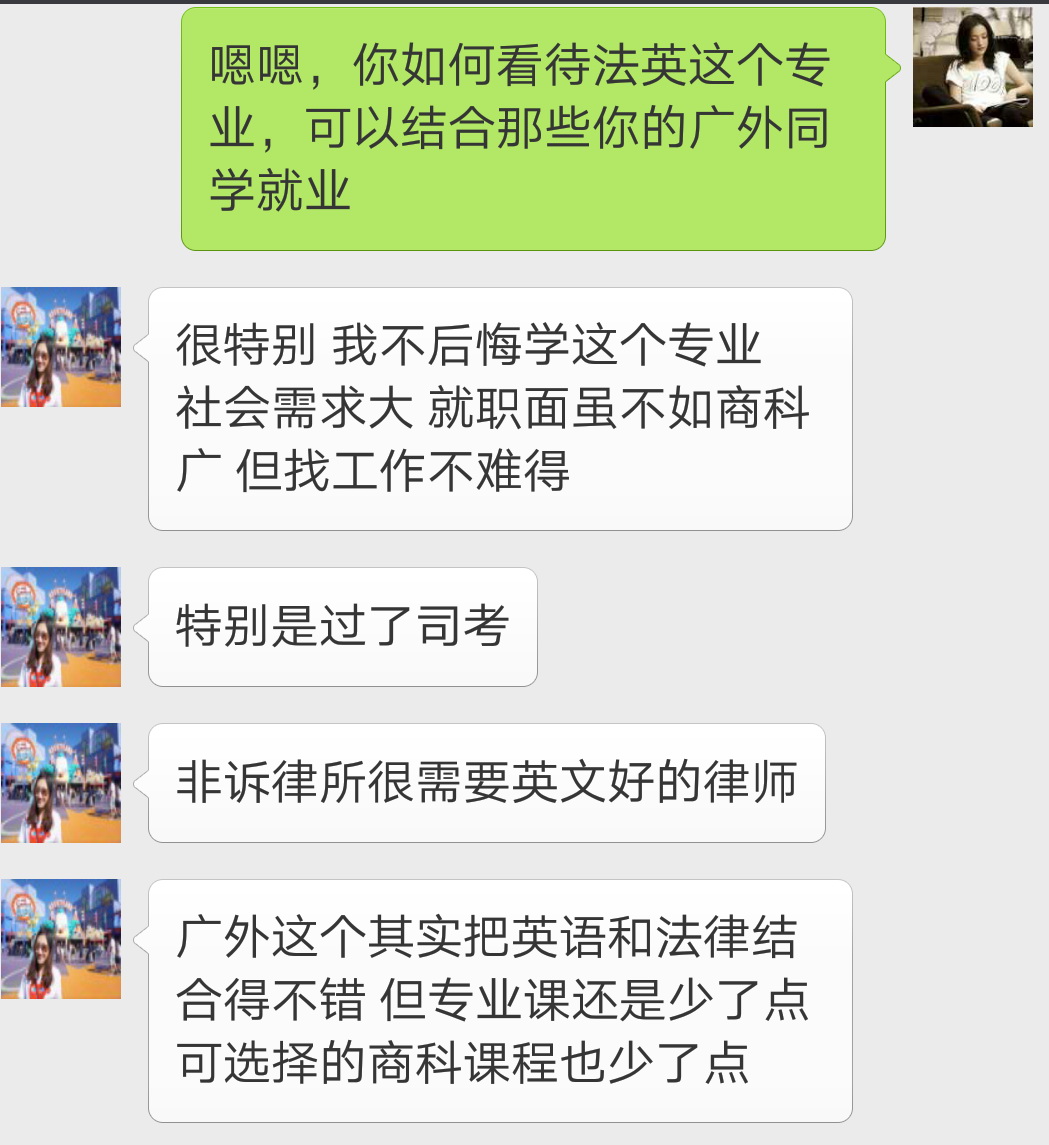 随后,Beuture小组成员向师姐提问关于她对广外商英学院法英专业的看法,师姐对法英专业表示了很大的肯定。她说:“很特别,我不后悔学了这个专业。社会需求特别大”。她还说到如果法英专业的同学过了司考,会更有竞争力。并且随后根据自己的经历,她给出了对学院这个专业课程设置的一些意见,如专业课少,在考司考和就业方面没有给同学太多的引导。