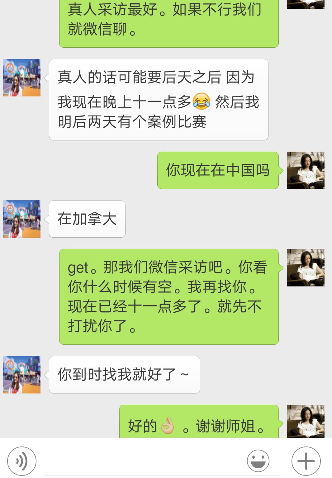 本网讯Beuture调研小组关于已毕业的商务英语(国际经济法)专业的师兄姐就业现状的调研已经开展到了第五天。2016年8月9日上午,Beature小组成员对一名远在加拿大读研的师姐进行了微信采访。尽管师姐自身比较忙,却很热情地答应了Beuture小组的采访。