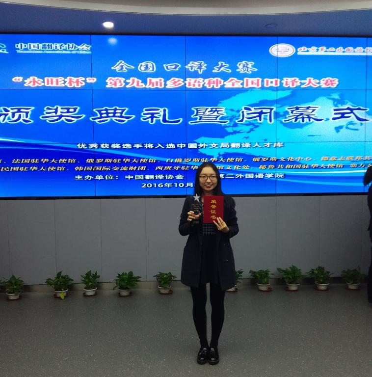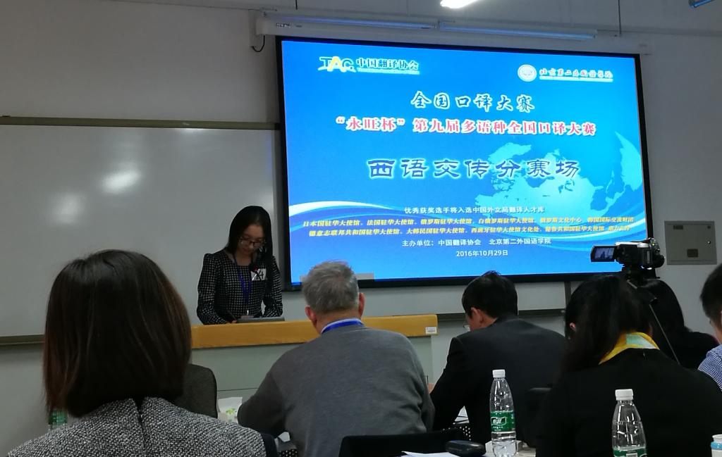 2016年10月29日,“永旺杯”第九届全国多语种口译大赛在北京第二外国语学院拉开帷幕。本次大赛由中国翻译协会和北京第二外国语学院联合主办。今年参赛的高校达149所,设6个参赛语种,其中西班牙语交传首次作为比赛项目纳入该赛事。自今年6月份以来,西班牙语系2015级研究生方晓燕同学在陈星老师和吴凡老师的指导下积极备赛,先后通过全国初赛、复赛,最终闯入总决赛。此次比赛设一等奖一名、二等奖两名、三等奖三名。方晓燕同学凭借其扎实的语言基础和沉稳的临场发挥,最终决赛分数仅次于北外选手,荣获西语交传二等奖。