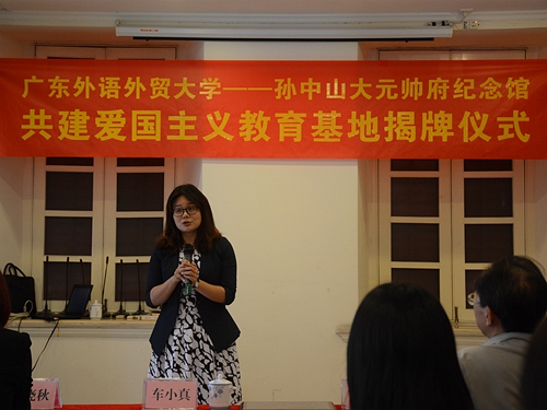 在本次活动中,广东外语外贸大学与孙中山大元帅府纪念馆合作建立了大元帅府纪念馆爱国主义教育基地。车小真在揭牌仪式中对馆方的信任和支持表达了感谢。今年是孙中山诞辰150周年,她希望通过共建爱国主义教育基地未来能更好地打造志愿服务。同时同学们能深入了解爱国主义与核心价值观。旧址承载了深厚的历史,是极好的学习机会。青马班为学员提供了思想教育的第二课堂,也希望同学们能积极参与以后的教育活动。