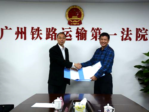 本网讯11月10日下午国际商务英语学院(以下简称商英学院)院长郭桂杭率副院长彭玲玲、副教授韩永红、07届校友李燕于广州铁路运输中级人民法院第二办公区进行实践基地签约。出席本次签约的法院方代表有广州铁路运输法院院长、审判委员会委员、审判员蔡才昂同志与广州铁路运输中级人民法院的领导喻东福。