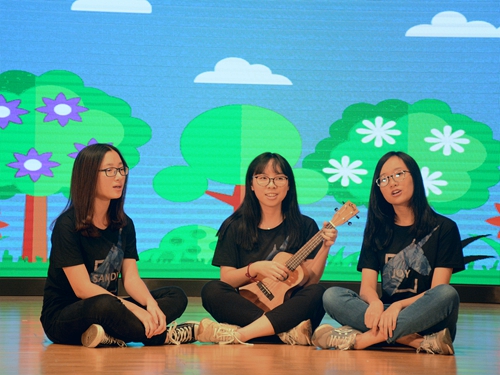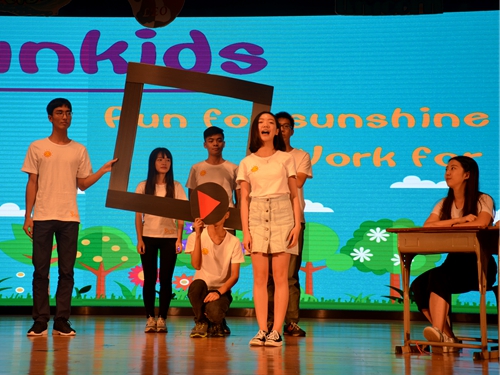 Sunkids服务小组以话剧的形式还原了与小学的孩子们进行课堂互动的场景,并配以精彩的歌舞表演,在活动一开始就吸引了观众的注意,炒热了现场的气氛。表演之后,Sunkids小组代表何方田、张紫涵分享了他们的教学经验,他们发现孩子们对多样化的课程抱有极大的热情,并勇于利用身边的资源去探索未知的领域。队员们将教学内容主要集中在记单词和理解课文的能力培养,并通过课堂上一些小游戏和互动激发小朋友学习热情,寓教于乐。队员在如何安排教学课程,如何进行课堂游戏与课外拓展等方面有了更深的了解。