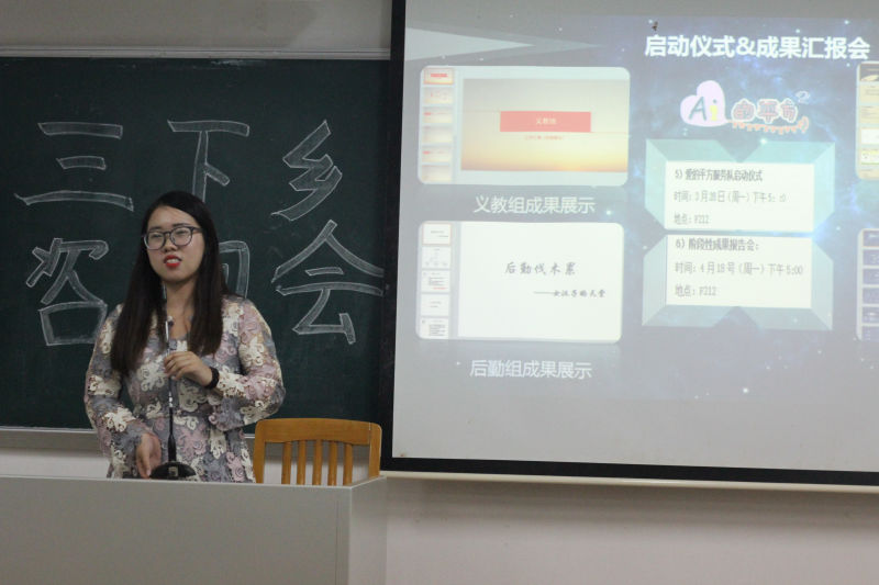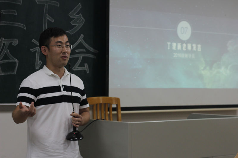 接下来是丁建新老师的发言。他向在场观众们讲述了自己去年在“三下乡”期间慰问服务队队伍的事迹,同时也分析了本学院与其他学院在“三下乡”活动领域的不同。他还说道,参加“三下乡”活动不是获得社会实践学分的唯一途径,没有参加此活动的学生不用灰心,但同时也强调参加此活动要有个人意识,要用积极的心态去传播正能量。最后,丁建新老师强调,“三下乡”活动会提倡义教组和调研组,而且将会提升调研组的地位,鼓励学生们积极参与调研。