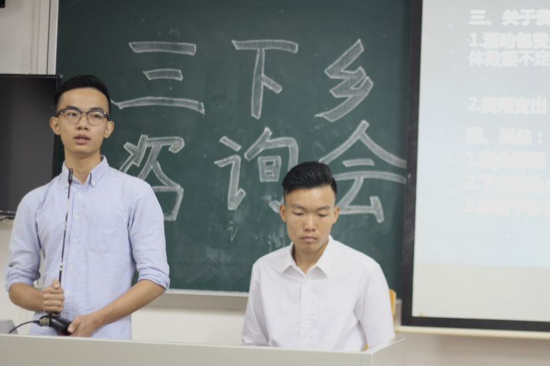 最后的环节是实践部部长许凯翔的答疑环节。他先是详细讲解了关于“三下乡”活动的各种问题,其中包括了时间、队伍、费用、安全、地点、环境、前往基地方式等问题。接着是自由提问环节,现场观众的其他各种疑问,部长都一一作出解答。