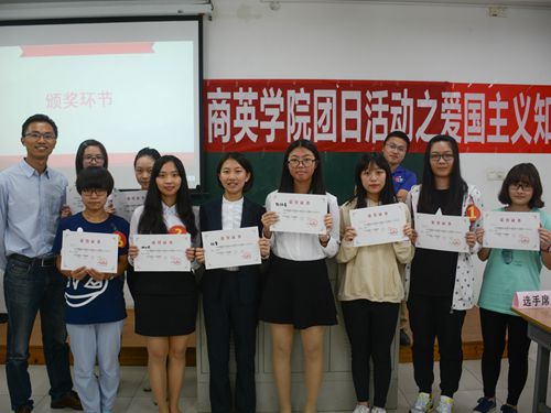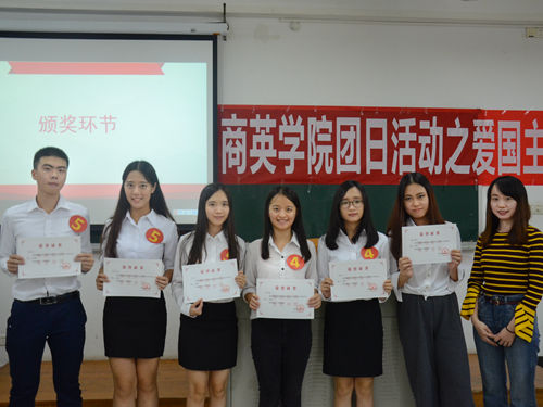 本网讯11月22日晚七点整,商英学院团日活动之爱国主义知识竞赛在北六教B212如期举行,此次竞赛邀请了商英学院党委副书记张林茂、商英团委书记万东方、龙飘飘老师和2016级辅导员莫小俊担任评委。