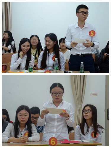 经过两个环节的博弈,第六小组以200分的高分居于首位,获得了在最后一个环节“头脑风暴”的优先选择机会,而最精彩的莫过于“头脑风暴”环节,选手们就自己选择的主题进行长达三分钟的阐述。第六小组就如何在现实生活中弘扬中山精神展开讨论,首先他们提出对中山精神最深刻的理解便是“天下为公”的理念,而作为大学生,关系国事,服务社会,充实自我便是对“天下为公”理念最好的回应。其次,他们指出“博爱”是中山精神的重要内容,“博”即“广泛地”,“爱”即“关爱”,“博爱”即“广泛地关爱”。最后,他们认为“振兴中华”最为孙中山先生一直以来的革命目标是中山精神的内核,而作为当代大学生,只有不断努力学习,积极向上,力求上进,才能成为更好地为祖国服务的精英,才能助祖国早日实现中华民族伟大复兴。