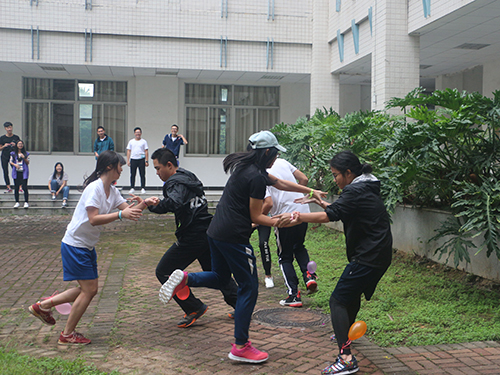 接下来的讲究速度胆量的“激情踩气球”环节就更是把参赛队伍的热情激发了出来。或脚步一前一前的试探,或脚步一后一后的退避,或单脚逃避,或双手阻挡,每个与对手的对抗的动作无不显示游戏的紧张刺激。其中表现突出是新闻社1的队员罗凯靖同学,在游戏将要结束时受到来自组织部一名男生,两名女生,外加一位黑衣人的夹击后倒地,在观众都以为气球无疑会很快被踩爆时,他用背部将双腿支起在空中旋转几周,巧妙地躲过了几次危险的攻击,最后抓住机会逃出重围,赢得全场观众一阵佩服的喝彩。