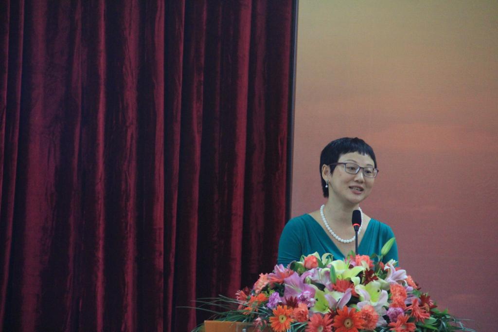 在这之后,英语教育学院教师代表张倩老师发表讲话,她与大家分享了自己与同事十五年来的艰辛奋斗历程。弹指一挥间,英语教育学院有了长足发展,获得了许多荣誉。英语教育学院在学术研究上勇攀高峰,取得了众多成果。十五年来,学院变化很大,但不变的是我们对学院深深的爱。她以幽默的语调,讲述了学院领导对老师无微不至的关心以及老师们对工作的满腔热情。最后,她祝福学院事业兴旺、前程似锦,预祝大会圆满举行。