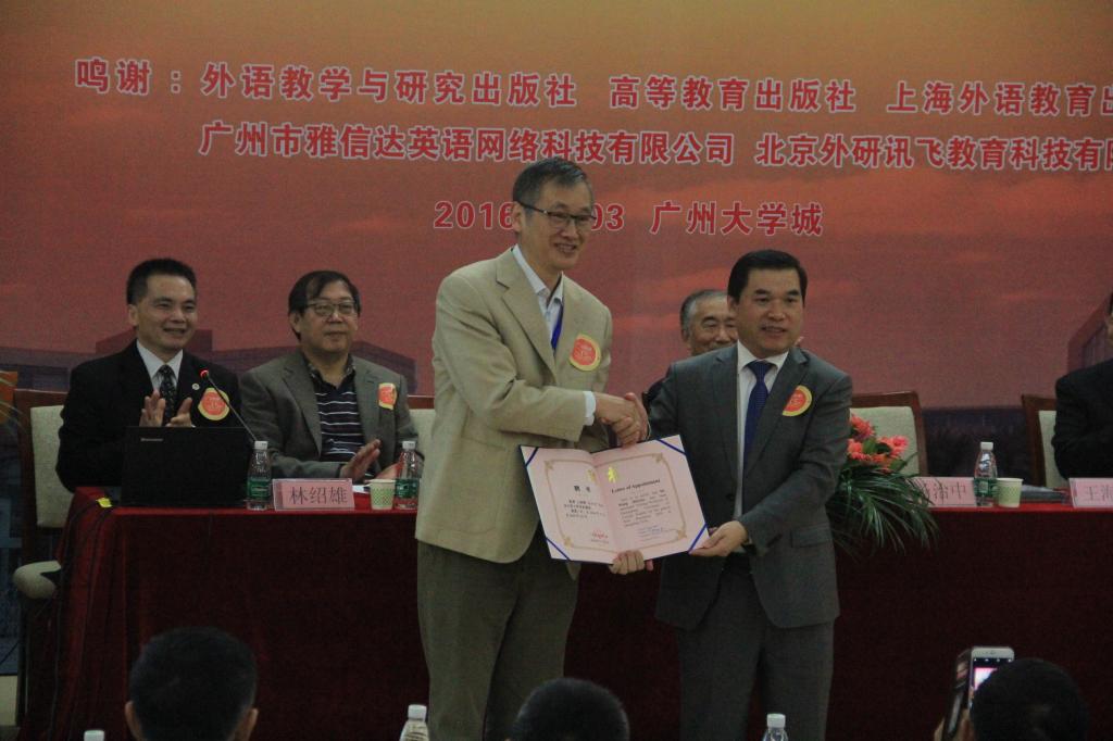 王海啸教授在致辞中说道:“广东外语外贸大学虽然是以外语专业的教育为特色的院校,但是历年以来,都非常重视大学英语教育。是外语类的专业院校中成为大学英语教育教学改革示范点的院校的典型代表。广外培养出来的学生,不仅具有扎实的专业基础,同时具有优秀的英语语言交际能力。”王海啸致辞后,焦方太为他颁发了客座教授聘书。
