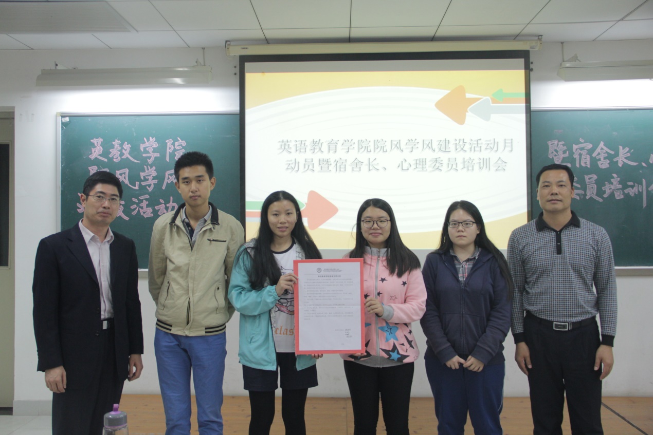本网讯2016年12月8日星期四晚上七点,英语教育学院院风学风建设活动月动员暨宿舍长、心理委员培训会在教学楼F209举行,出席的领导有学生处副处长刘军,党委副书记徐昶斌,团委书记林泽龙和辅导员迟殿凤。