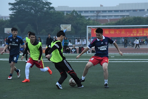 本网讯2017年3月16日17:20,广东外语外贸大学“经贸杯”足球赛首场比赛在假草场拉开序幕。14国贸队对战15国贸队,双方你争我夺,战况十分激烈。虽然15国贸队在最后时刻奋力一击,试图力挽狂澜,但最终仍不敌14国贸队,以0:1惜败。
