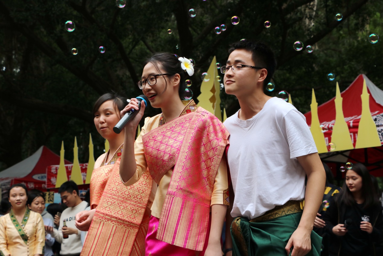 各国传统小饰品和特色小活动也成功吸引了来宾们的眼球,让人满载而归。日语摊位明信片、风铃、纸扇、各种型号的纸伞,半脸狐狸面具、全脸狐狸面具,御守,手鞠等应有尽有。泰语摊位则展现了宋干节(泰国新年)泼水仪式。马来语摊位上到处悬挂着精美的风景明信片,展示着马来西亚独特的民俗风情和旅游名胜。乌尔都语系摊位延续了去年的曼海蒂手绘活动的传统,依旧人气不减,摊位前早早就排起了长龙。各摊位前身穿各国服装的同学也为摊位增添了不少人气,受到很多来宾的合照邀请。