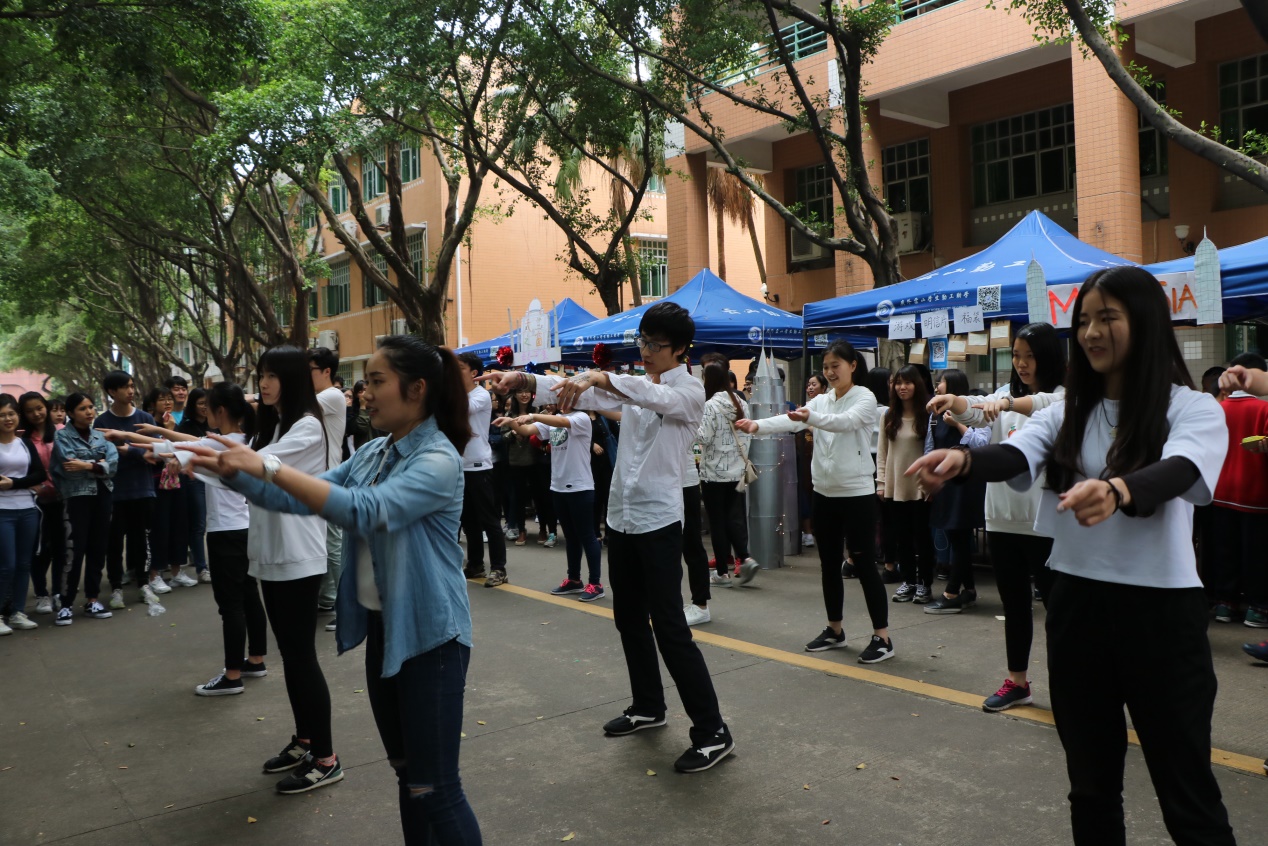本次亚洲风情街以“快闪”的穿插性表演形式在摊位前的空地进行了歌舞串烧表演。各语种的表演或温婉柔情,或劲歌热舞,各具特色,引得观众呼声不断。其中,乌尔都语同学用乌尔都语翻唱了《父亲》;朝鲜语表演小组轮番上阵,快节奏热舞展现青春风采;阿拉伯语同学身穿阿拉伯特色服装,一袭红衣分外妖娆;日语同学则多人上阵,跳起了集体舞;马来语外教也加入了歌舞的行列,团结的风貌更是让现场热闹非凡。