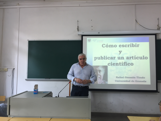 在讲座的一开始,教授对格拉纳达大学进行了简短的介绍,随后开始了对于论文,特别是期刊论文的一些讲解。他指出,发表一篇论文并不是一件简单的事,特别是发表论文在一本优秀的期刊上,这也就引出了对要投稿的期刊的选择的问题。在选择期刊时要考虑它的发行量和权威性,当然它的拒绝率也会随着它的质量相应升高,因此不要害怕失败。